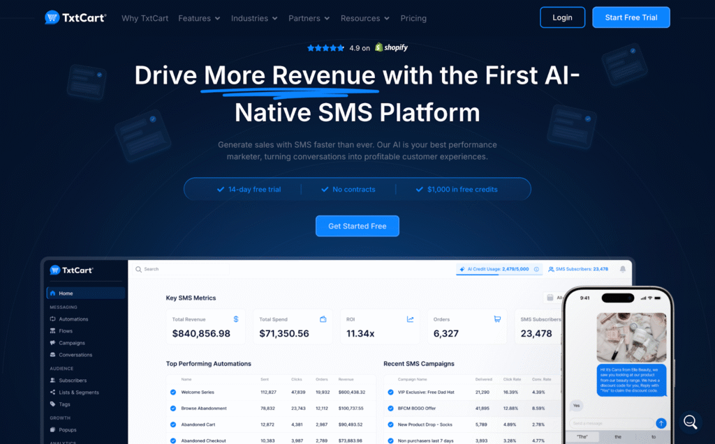 TxtCart is an AI-native conversational SMS marketing platform built mainly for Shopify brands, but it’s increasingly relevant for agencies that manage eCommerce clients. Instead of treating SMS as a one-way broadcast channel, TxtCart focuses on two-way, human-like conversations that help recover carts, answer questions, and drive repeat purchases automatically.